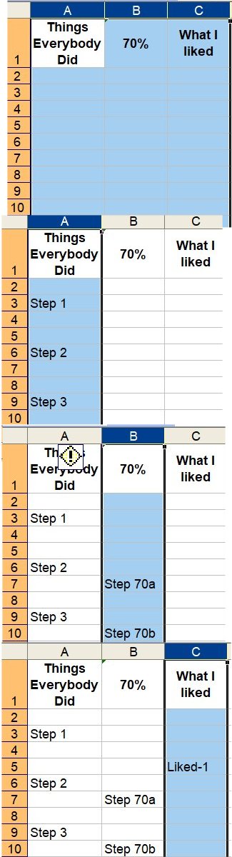 - Combine the three columns into one and look at your plan. Are there “Things Everybody Did” which you balk at? Do they have a “70%” item right under them? Good, you’re safe, do the “70%” thing in place of the “Things Everybody Did” item. Say you don’t like Step 3. You’ve got Step 70b right under it so do 70b instead of 3. Say you don’t like Step 8. Too bad, you’ve got to do it, you’ve got nothing to take its place, and no shuffling around to make things fit! (bottom)